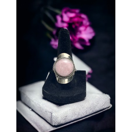 Beautiful pink round ring made of an alpaca silver material and peruvian natural rose quartz crystals.