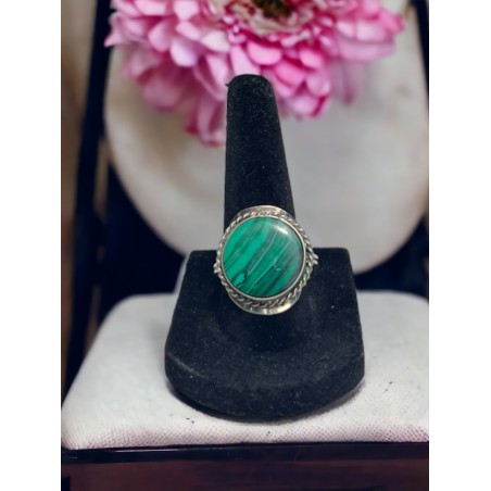Beautiful black and green round ring made of an alpaca silver material and natural malaquite gemstones.