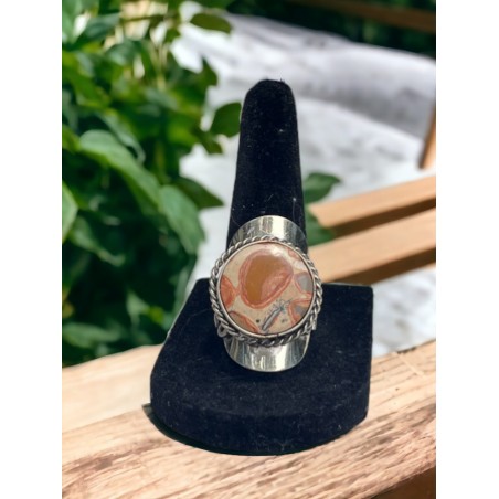 Beautiful nude leopard round ring made of an alpaca silver material and peruvian jasper gemstones.